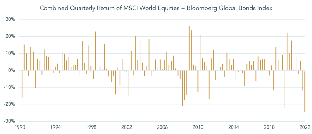 Rising yields affect the valuation of any asset that derives its value from the discounting of future cashflows to a present-day value. Nearly all equities were adversely impacted by this relationship to some degree last quarter, but asset-light sectors such as technology, where much of the value lies in future cashflows, were among the poorest performers. Given the significant proportion of major equity markets accounted for by the technology sector, for example the S&P 500 is 26% technology, investment managers allocating in accordance with market capitalisation have suffered significant losses in their equity portfolios. The pain has been widespread, not least because investing by market capitalisation is typical of passive investment strategies such as ETFs, which have attracted significant capital inflows in recent years. The chart below illustrates the magnitude of the combined losses in bonds and equities this quarter, the largest for 30 years.
